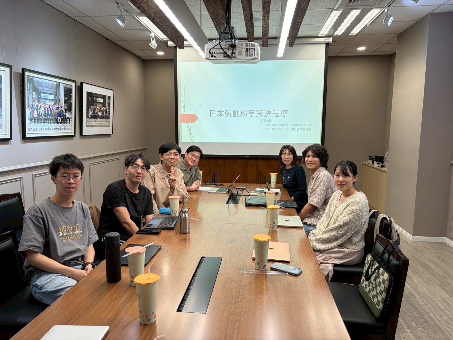 於演講結束後,本院師生們亦積極向戶谷教授發問,有同學對於勞動糾紛解決所花費的時間感到好奇,亦有同學從台日法制的差異出發,提問為何日本未採取單一工會制;另有同學提出演講內容外的疑問,例如日本外送員目前的法律地位。於同學們主動、積極地發問,與戶谷教授的認真而細緻的回應之下,講者與聽者或皆對於台日勞動紛爭解決程序,有了更多面向的認識。最終本場演講於全體參與者的合照後順利地劃下句點,並期待未來能持續開展交流活動。